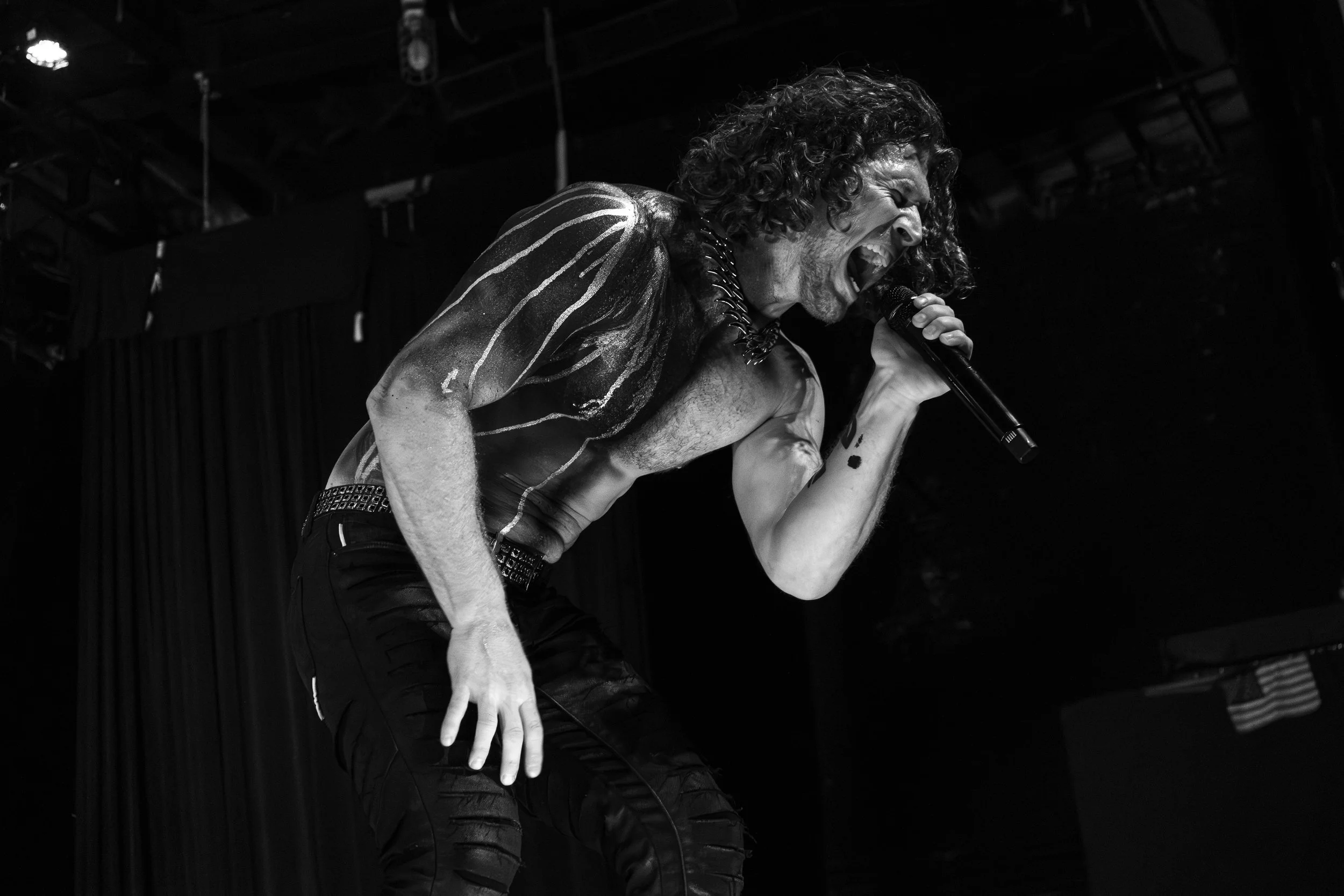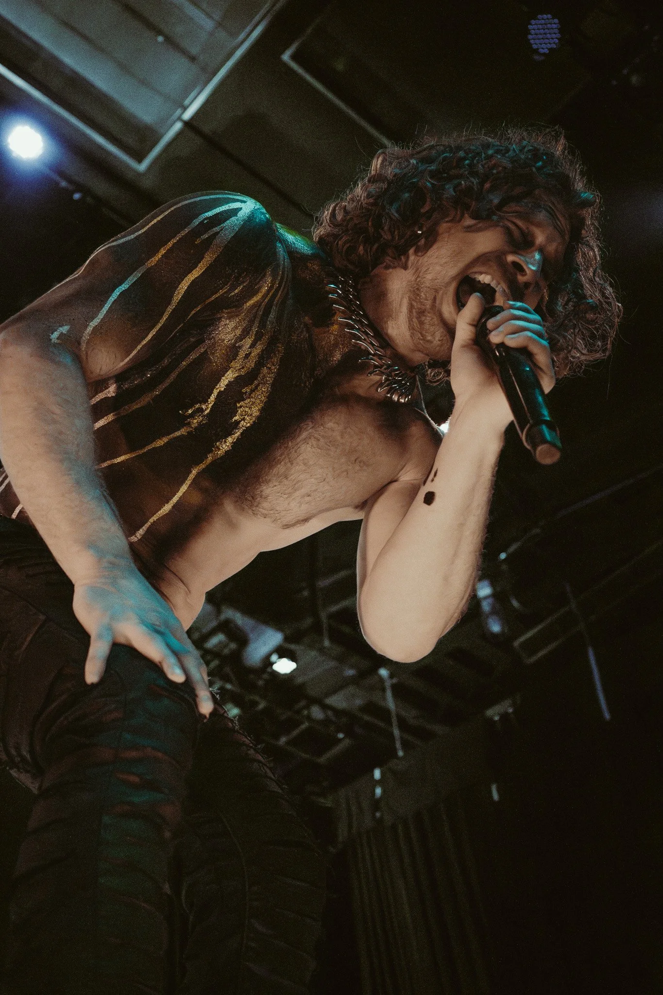 Frontman Jonny Hawkins took the stage with his right chest and arm painted black, accented by sharp streaks of gold running across his skin, a striking visual detail that glimmered in the stage lights.