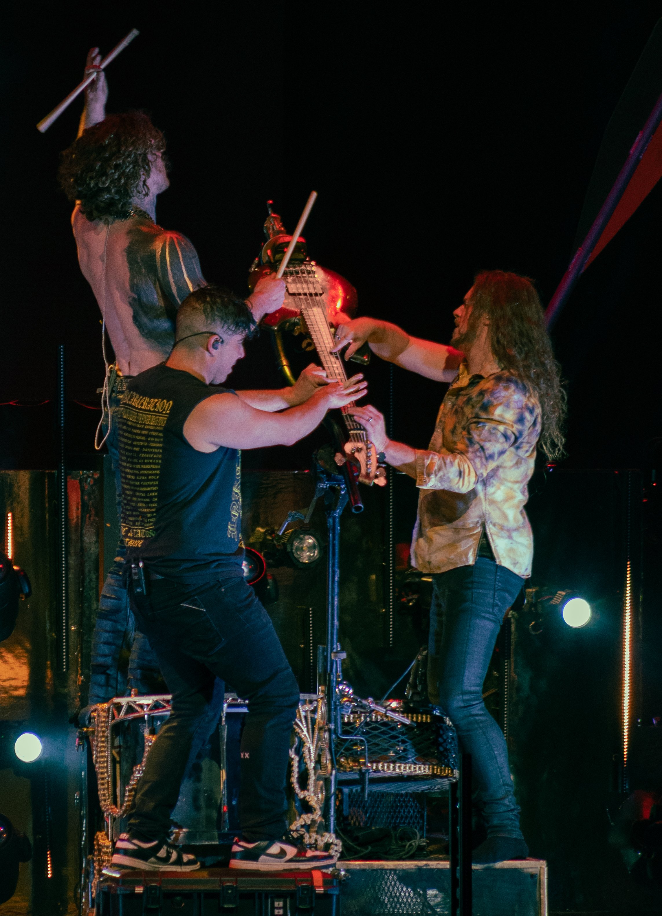 At center stage stood one of the night’s most technically ambitious elements, the band’s custom rotating guitar rig. Engineered to spin in wide arcs, the rig complemented the arrow imagery framing the stage as the trio of members began to gather around the instrument to play simultaneously. Vollelunga and Oliver played from opposite sides of the extended guitar while Hawkins struck its body percussively, drumming the rotating structure as it swung and pivoted above the stage.